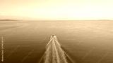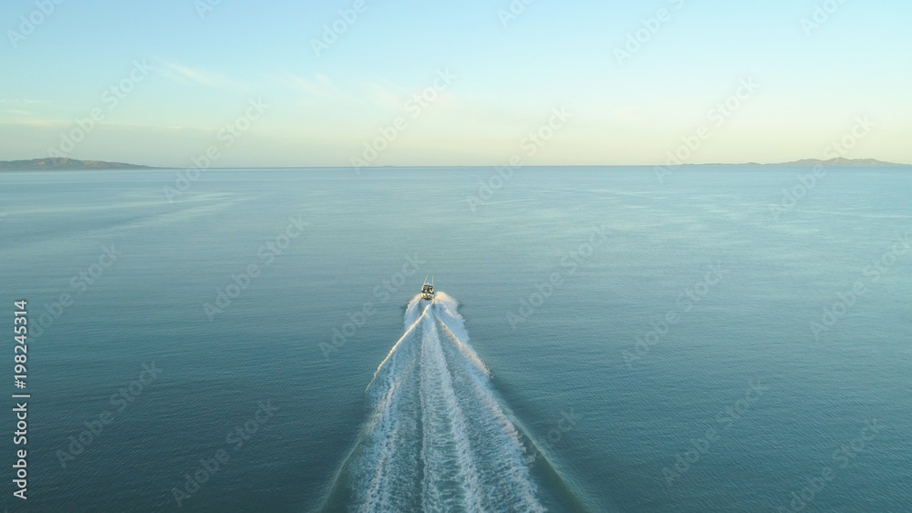 AERIAL: Fishing boat leaves a trail in ocean water as it speeds towards horizon.