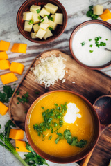 Top view of pumpkin cream soup on wooden table
