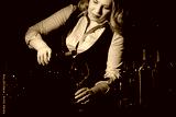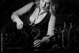 Professional woman sommelier pouring red wine into glass at bar counter. Elegant beverage presentation and precise restaurant service technique.