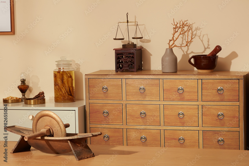 Traditional herbal medicine interior showing wooden drawers, grinding tool, and dried medicinal ingredients arranged on preparation table.