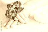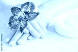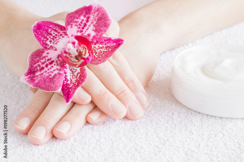 Beautiful groomed woman's hands with cream jar and fresh purple orchid flower on the white towel. Cares about clean and soft hands skin. Manicure beauty salon. Gentle atmosphere. Healthcare concept.