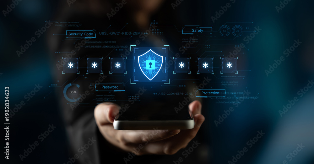 A concept of an advanced cybersecurity system. The futuristic interface shows a multi-factor authentication process using a secure password or PIN for enhanced data protection. Fermion