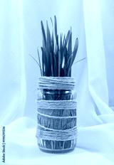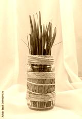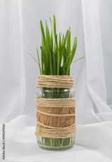 a stalk of green grass in a glass jar hand-decorated with scoop and craft on a white background