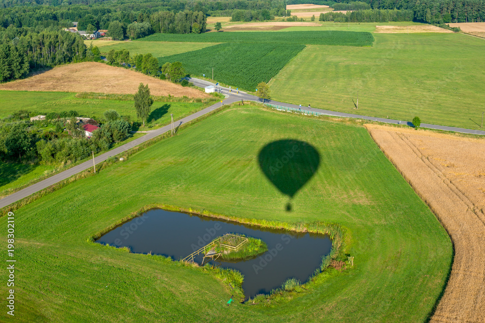 Cień balonu lecącego nad polami ze stawem, w dole widać drogi i pola uprawne.