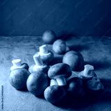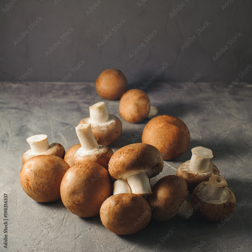 Button mushroom - swiss brown champignons royal on a gray background. Food macro photo