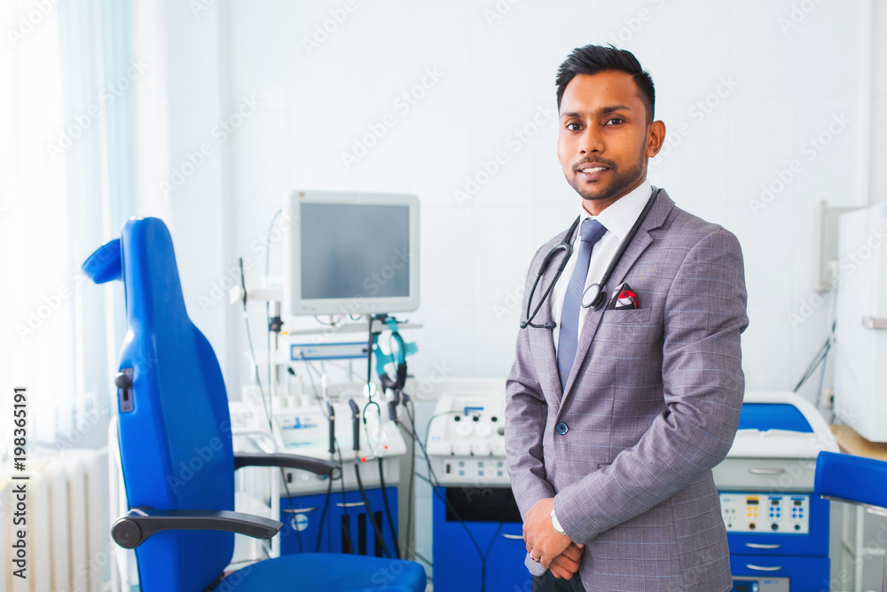 Asian young rich doctor with a smile is looking at the camera. medicine, health care and the concept of people - a male otolaryngologist in the hospital ward.