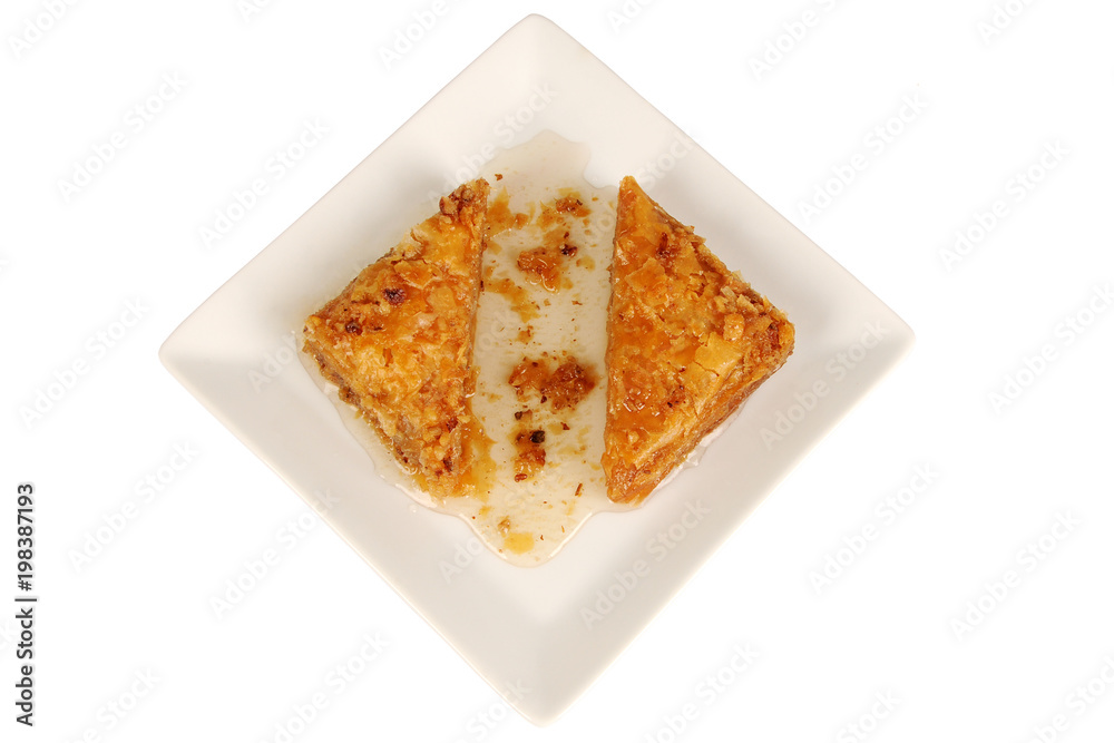 Traditional oriental dessert baklava with syrup. Two pieces of baklava on plate, isolated.