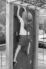 Full length view of little girl in pink hat climbing at playground in natural bushland setting (selective focus)