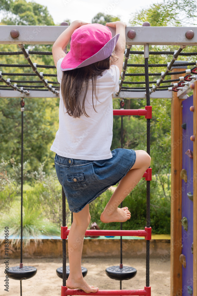 Full length view of little girl in pink hat climbing up rope frame at playground in natural bushland setting (selective focus)