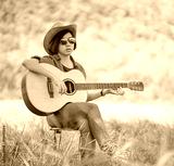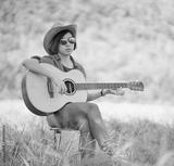 Women short hair wear hat and sunglasses sit playing guitar in grass field