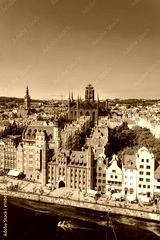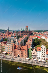 Gdansk Old City in Poland with Gothic St Mary church, Mariacka Gate, City Hall tower, historical houses and the promenade along the riverbank of Motlawa river. Aerial view. Vertical.