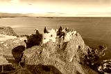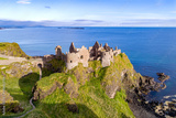 Ruins of medieval Dunluce Castle on a steep cliff. Northern coast of County Antrim, Northern Ireland, UK. Aerial view.