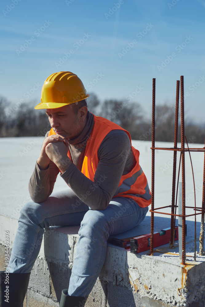 Construction worker having a heatstroke on a hot sunny day, headache, issues on a construction site outdoors.