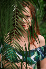 Beautiful young pregnant caucasian redhead woman in palm leaves