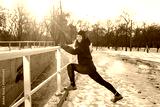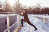 young woman athlete in black sport suit run in winter park