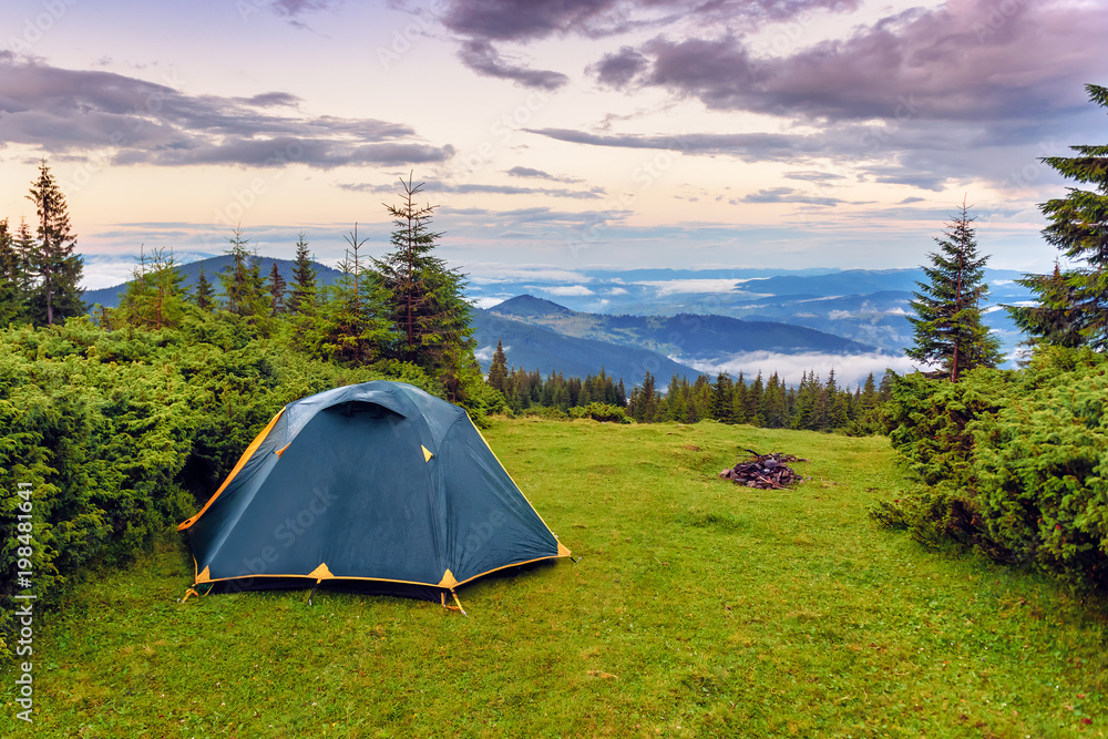 tent on the green grass in the mountains