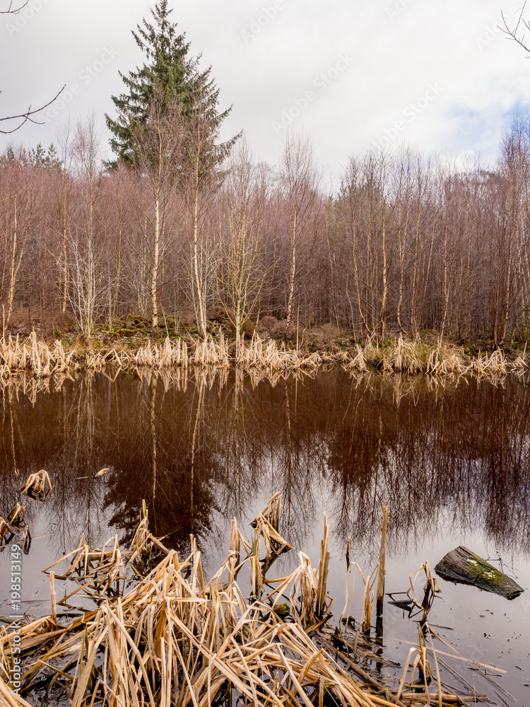 Winter forrest in marshland with locaclised pond water at Penrith, Cumbria, UK
