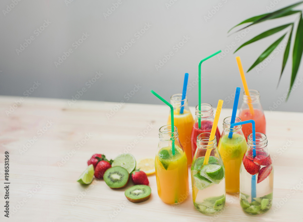 A few glass bottles on table with different fruit coctails.