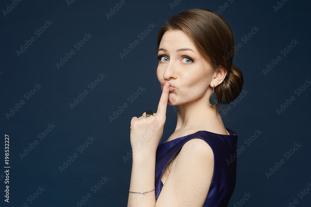 Portrait of fashionable brunette model girl, with blue eyes and in blue dress, with finger near mouth, isolated at navi background