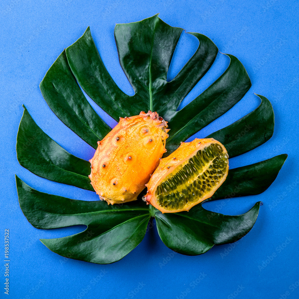 Creative layout made of summer tropical fruits and tropical leaves monstera on blue background. Flat lay. Tropical food concept.