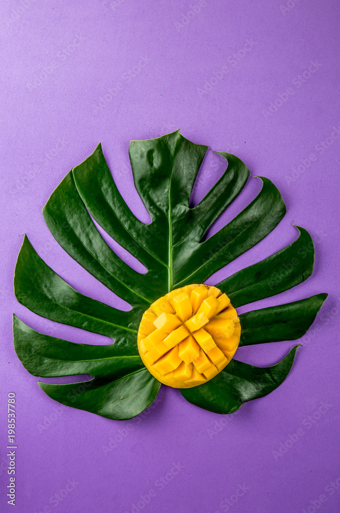 Creative layout made of summer tropical fruits mango and tropical leaves on purple background. Flat lay. Tropical food concept.