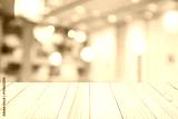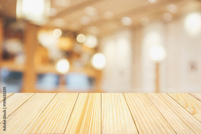 wood table with abstract blurred cafe restaurant with bokeh lights defocused background