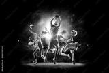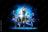 Multi-sport collage depicting various sports and hobbies. Isolated on a black. A joyful collage of several sports. Athletes on a beautiful black background with a flash of light behind them.