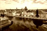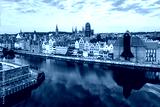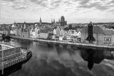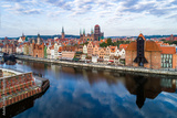 Gdansk old city in Poland with the oldest medieval port crane (Zuraw) in Europe, St Mary church, Town hall tower and Motlawa River. Aerial view, early morning