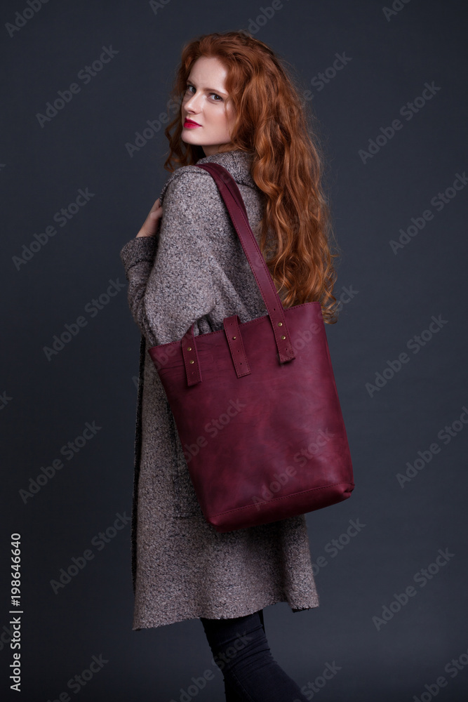 Red hair fashion model holding large leather bag