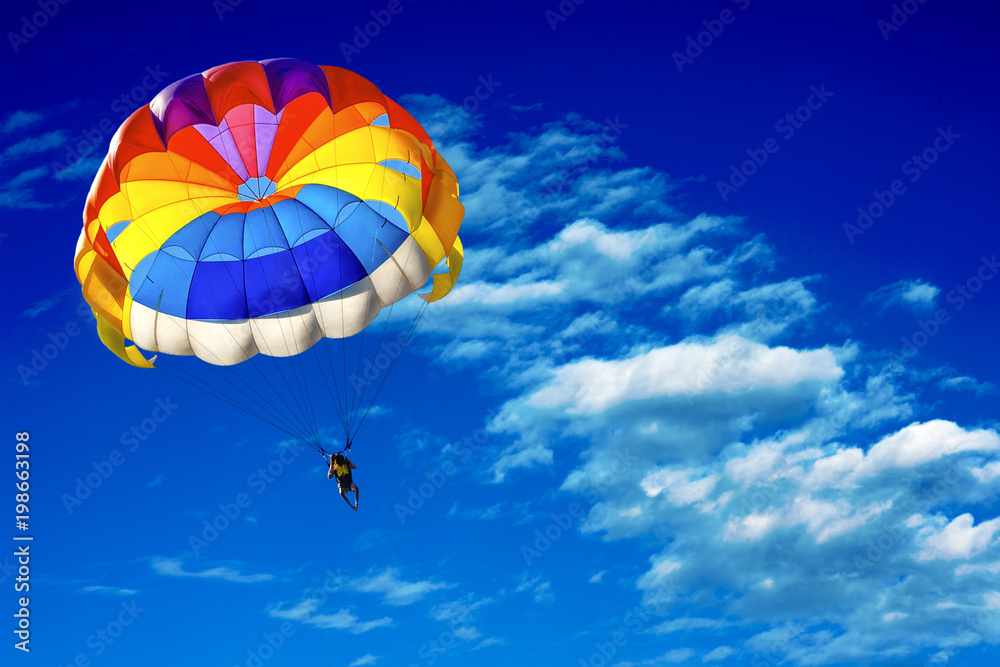 A man is gliding using a parachute on the background of cloudy blue sky.