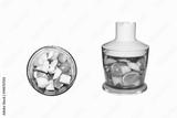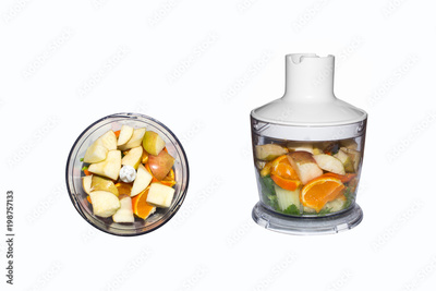 Fruits and vegetables in blender on white background. Smoothies in blender of fruits and vegetables on white background.