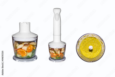 Fruits and vegetables in blender isolated on white background. Smoothies in blender of fruits and vegetables on white background.