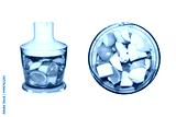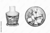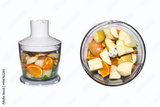 Fruits and vegetables in blender on white background. Smoothies in blender of fruits and vegetables on white background.