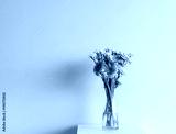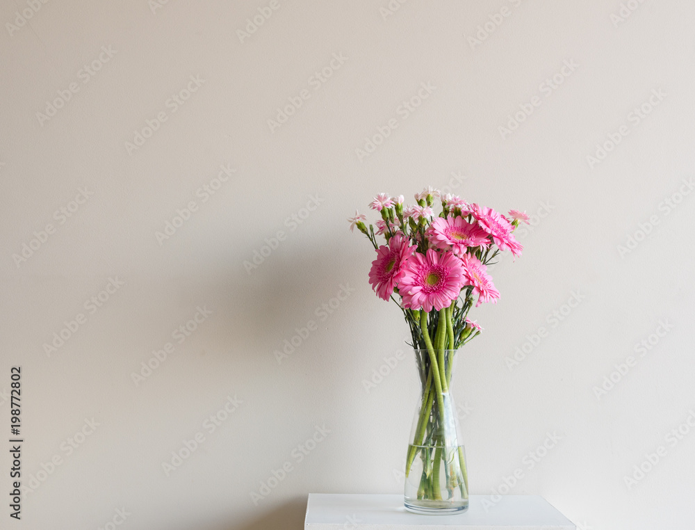 Close up of pink gerberas and carnations in glass vase on small table against neutral wall background with copy space