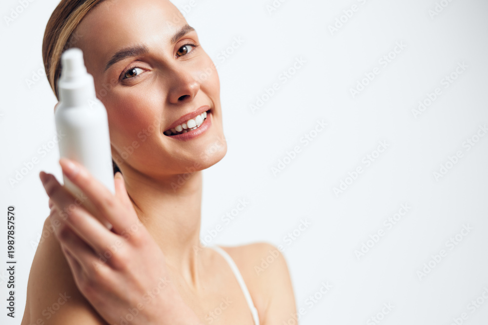 Young woman holding skincare spray bottle, beauty close up on face, serum and hygiene concept, smiling during skincare routine, fresh skin, clean light background