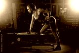 Beautiful sporty woman doing power fitness exercise at sport gym. Girl with dumbbell black and white.