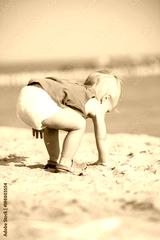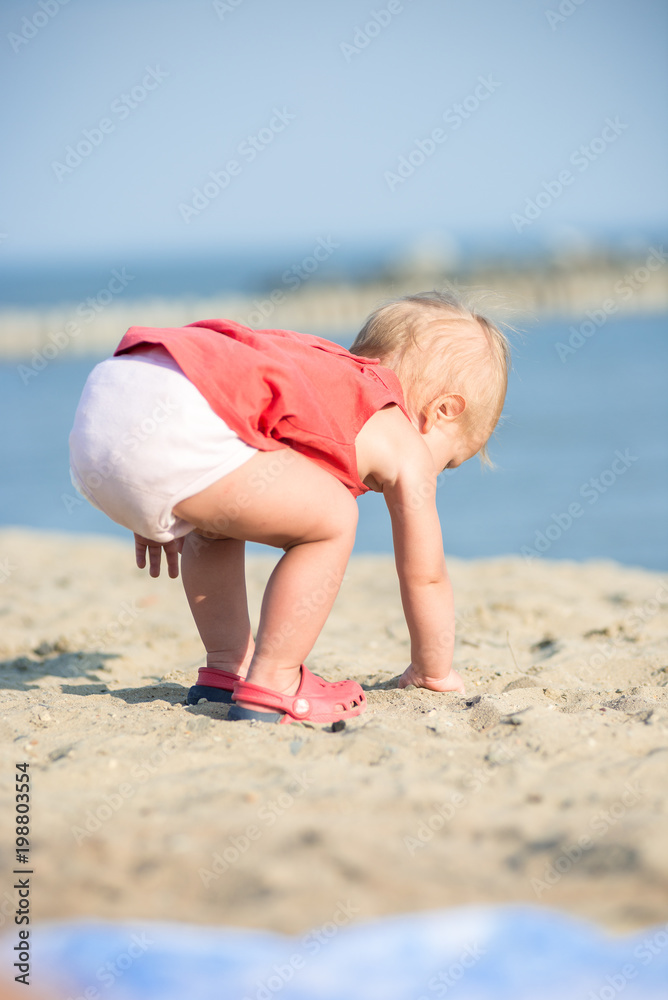 Baby playing on the sandy beach near the sea. Cute little girl in red dress with sand on tropical beach. Ocean coast.