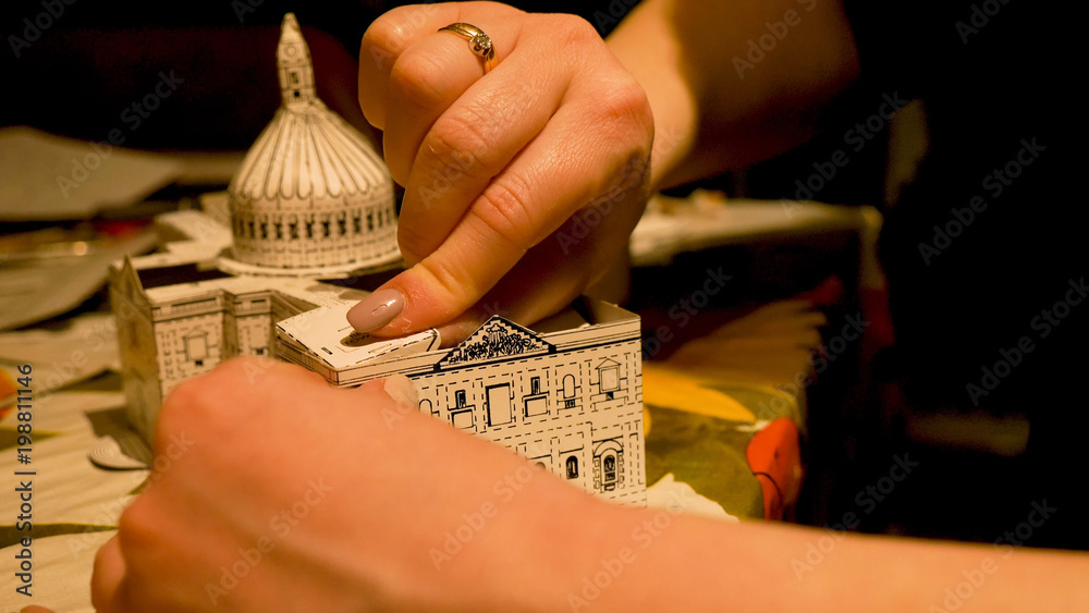 Female hands assembling Saint Pauls Cathedral building model at home. Hobby and leisure