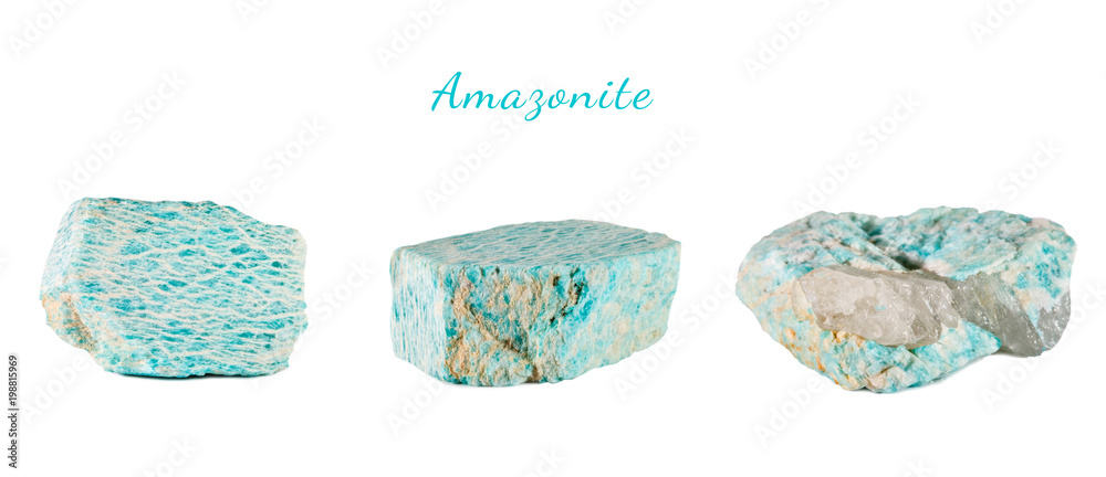 Macro shooting of natural gemstone. Raw mineral amazonite. Isolated object on a white background.