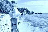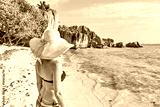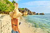 Beautiful young woman tourist in Anse Source Argent beach, La Digue Island, Seychelles.