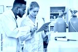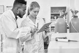 Serious thoughtful medical colleagues using digital tablet while viewing report together and discussing results standing by oxygen cylinders in laboratory