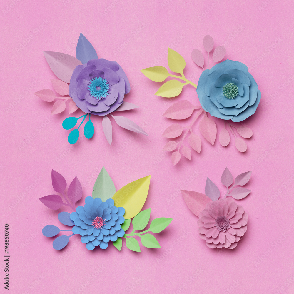 3d rendering, paper flowers, botanical clip art, isolated design elements, floral backround, pastel candy colors, vibrant palette