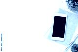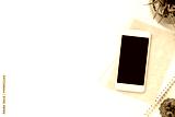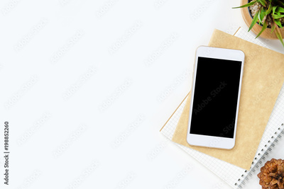 Smartphone with blank screen is on top of white office desk table with supplies. Top view with copy space, flat lay.
