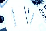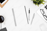 Blank notebook is on top of white office desk table with laptop, coffee cup and office supplies. Top view with copy space, flat lay.