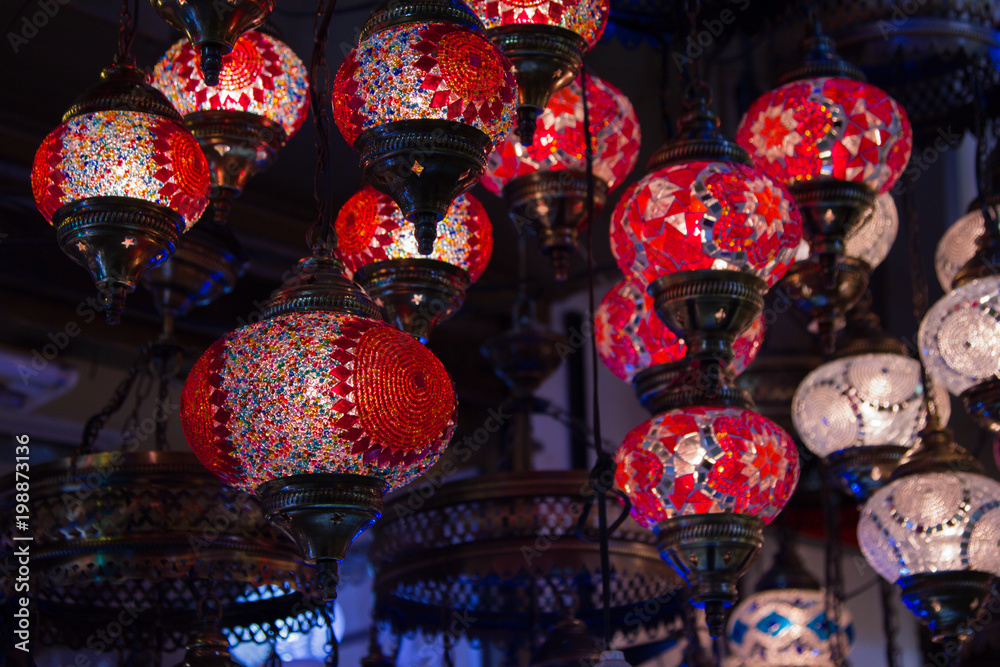 View of traditional bright decorative hanging Turkish lamps and colourful lights with vivid colours in the Grand Bazaar. Istanbul. Turkey. Most popular souvenirs for tourists.