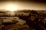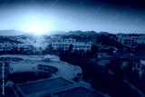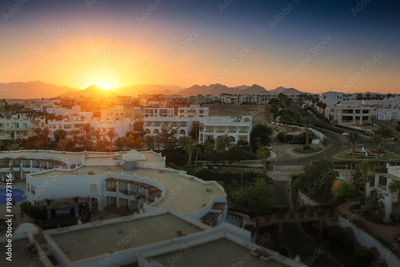 View of buildings of the luxury hotel at sunset. Sharm el Sheikh, Egypt. Sinai Mountains.