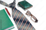 Men's accessories. Tie, green notebook, glasses, purse, business card holder. White background.