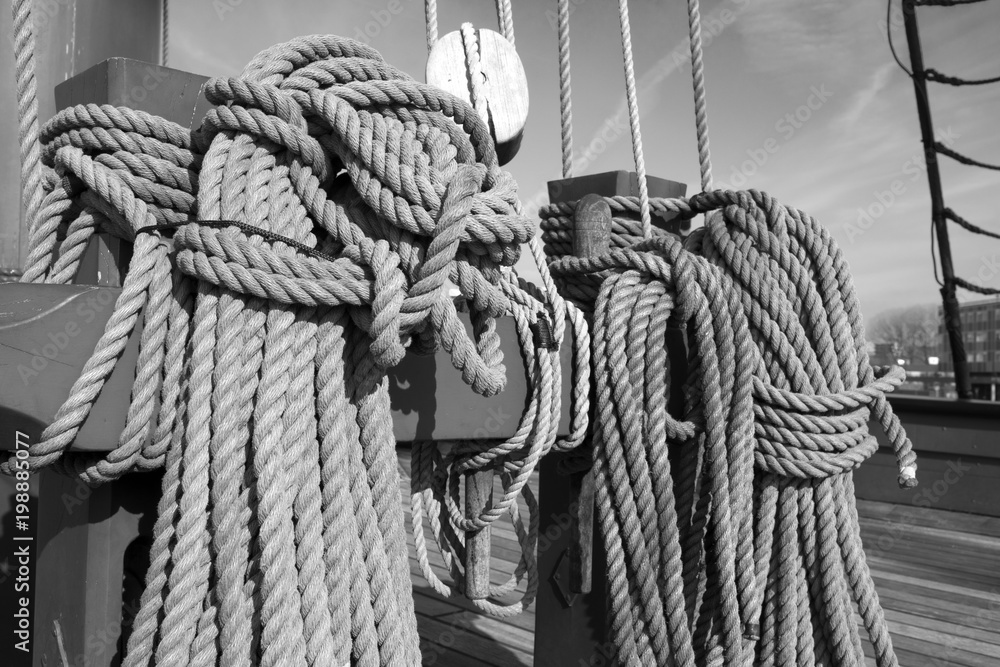 Ropes, pulley, shroud - parts of an old ship, sailboat. Blue sky in the background.