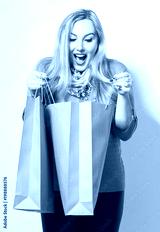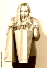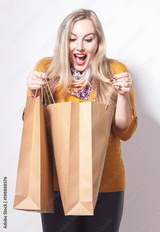 Beautiful woman is making Christmas shopping, enjoying and excitedly looking into the bag. The concept of Christmas.