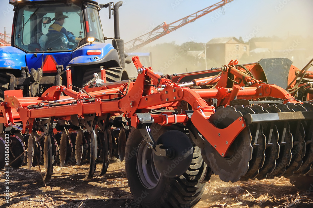 Details of a modern combine harvester close-up. modern combine harvester works in the field. Sowing and harvesting.
